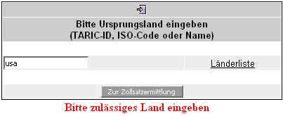 Bei einer falschen Eingabe weist eine Laufschrift darauf hin, dass ein zulässiges Land einzugeben ist:
