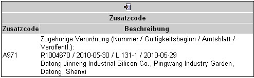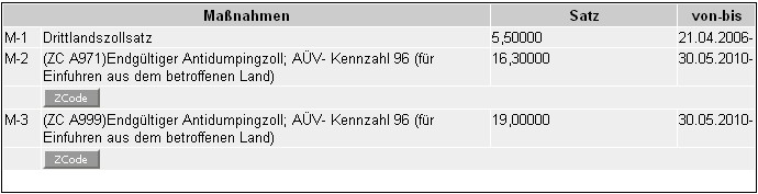 Anhand der laufenden Maßnahmennummern sehen Sie, dass hier verschiedene Zusatzcodes aufgeführt sind. So wird z. B. unter Hinweis auf den Zusatzcode (ZC) A971 bei der Maßnahme 2 der Zollsatz "16,3%" und beim Zusatzcode A999 (Maßnahme 3) der Zollsatz "19%" angezeigt.