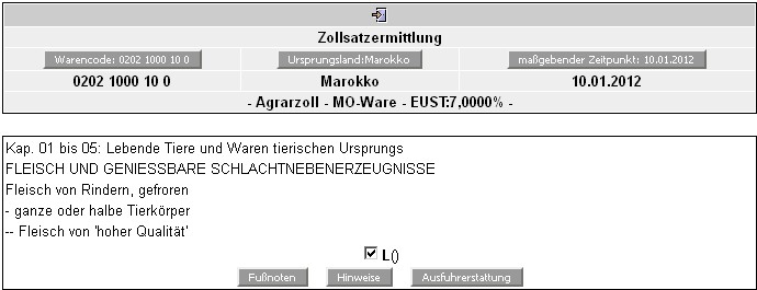 Sie sehen jetzt die so genannte Ausfuhrerstattungsnomenklatur. Bei den vierstelligen Ziffernfolgen in der Spalte ZC handelt es sich um den entsprechenden Zusatzcode.