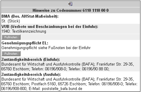 Hinweise zeigen grundsätzlich Maßeinheiten, Zuständigkeitsbereiche, eventuelle Verbote und Beschränkungen sowie Einzelheiten zur Einfuhrliste an.
