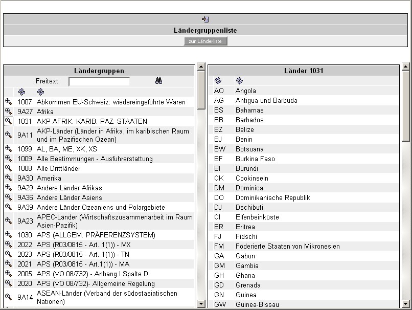 Um zu ermitteln, welche Länder z. B. der Gruppe der afrikanischen, karibischen und pazifischen Staaten angehören, klicken Sie auf die Lupe neben '1031':