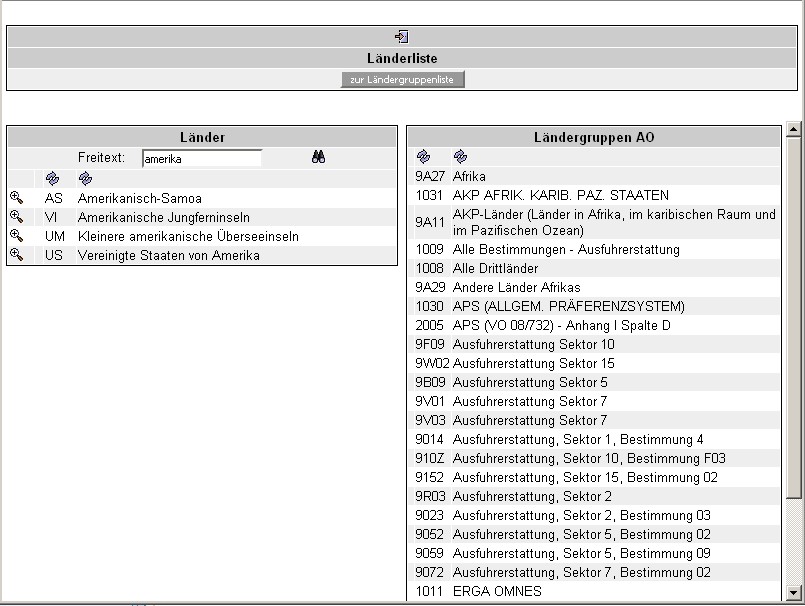 Ausgehend von der Länderliste ist die umgekehrte Suche (von der Gruppe zum Land) möglich.