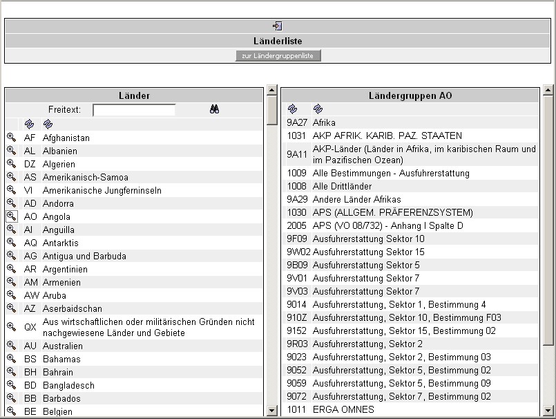 Die linke Fensterhälfte beinhaltet die Länderliste mit der Angabe des ISO-Codes und der Bezeichnung des Landes. Wählen Sie ein Land aus (z. B. Angola) und klicken Sie auf die Lupe am linken Rand: