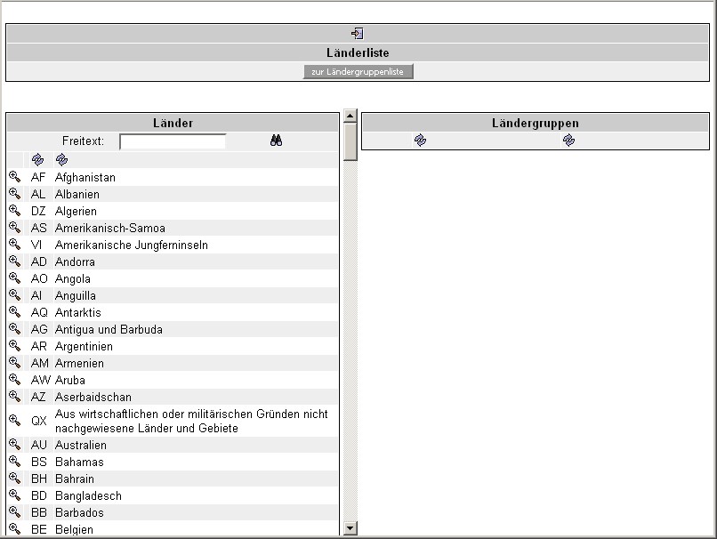 , der Sie wieder zur Länderliste zurückbringt. Zwischen den beiden Fenstern 'Länderliste' und 'Ländergruppenliste' können Sie beliebig hin und her wechseln.