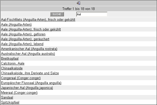 Die Stichworte sind alphabetisch geordnet. Im weißen Textfeld ist standardmäßig das erste Wort der EU-Stichwortliste eingetragen (hier: Aal); angezeigt werden alle Begriffe, die die Textfolge "aal" enthalten.