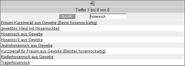 Sie sehen alle Treffer, in denen das Wort "hosenrock" in der Stichwortliste vorkommt. Von dort gelangen Sie unmittelbar zur zutreffenden Stelle in der Nomenklatur.
