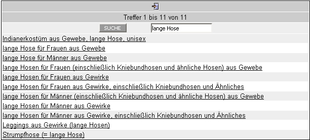 Klicken Sie auf "lange Hosen für Frauen aus Gewirke" und TARIFE springt unmittelbar an die zutreffende Position 6104.