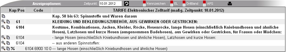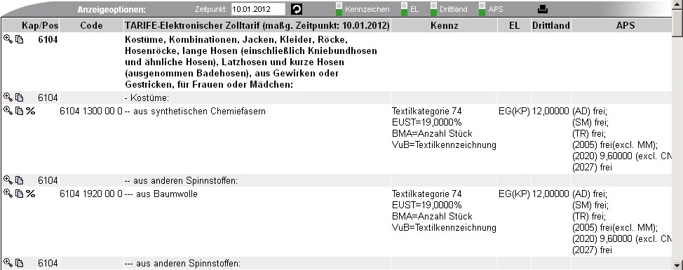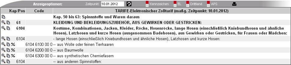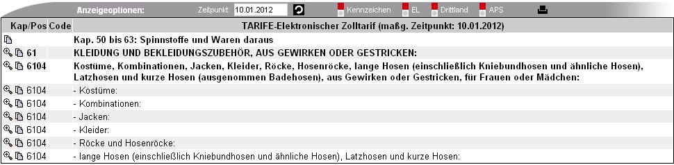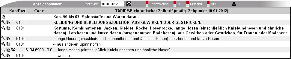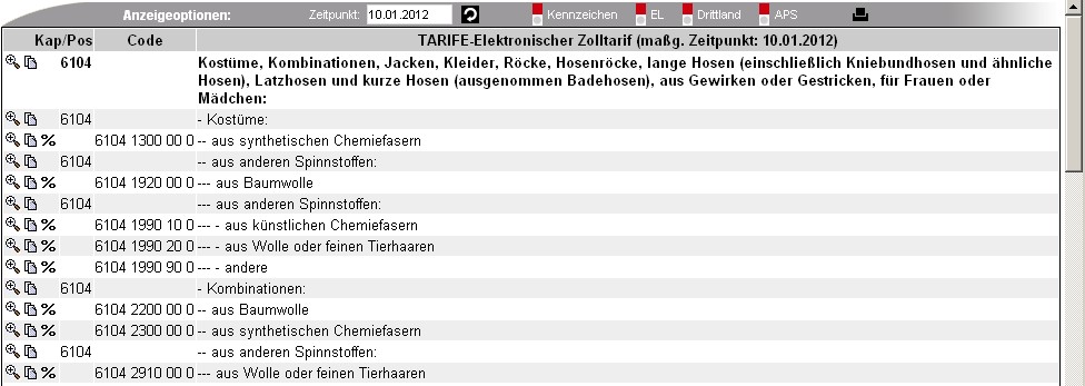 Falls Sie Zweifel haben, ob Ihre Ware tatsächlich hierher gehört, doppelklicken Sie auf das Textsymbol neben der Lupe und Sie werden zu einer HTML.-Datei mit den Erläuterungen zur Position 6104 geführt.