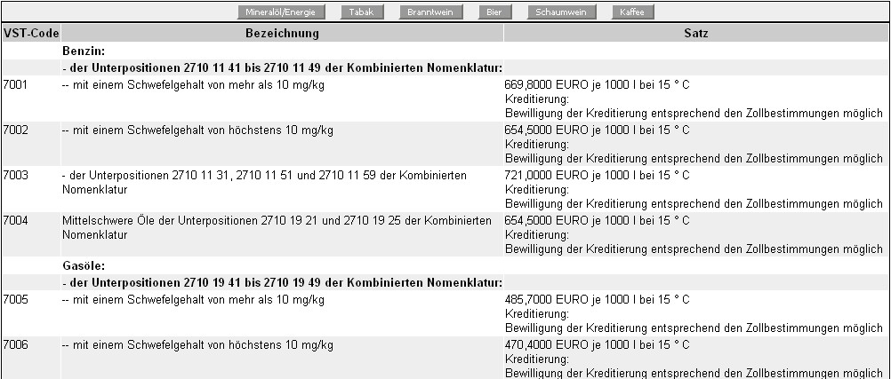 Mit diesem Menü können Sie sich einen allgemeinen Überblick über die Verbrauchsteuern und die Höhe der Verbrauchsteuersätze verschaffen: